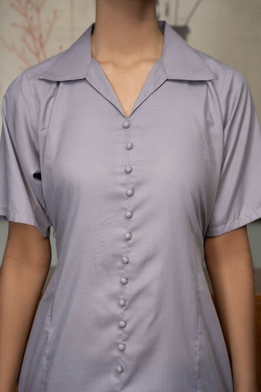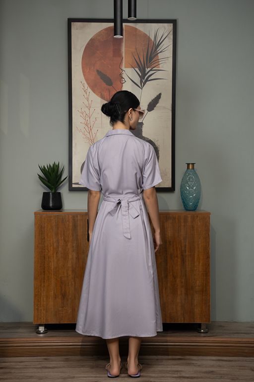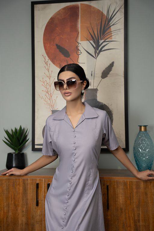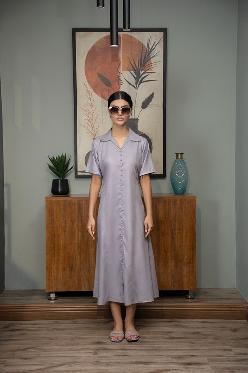 A long, dusky-toned dress with a coat-collar neckline and front-button design — timeless, versatile, and workwear-ready